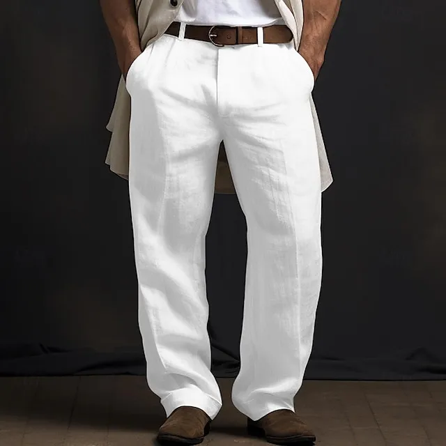40% Linen Men’s Linen Pants Trousers Summer Pants Button Pocket Straight Leg Plain Breathable Comfortable Office / Career Daily Vacation Classic Casual Black White