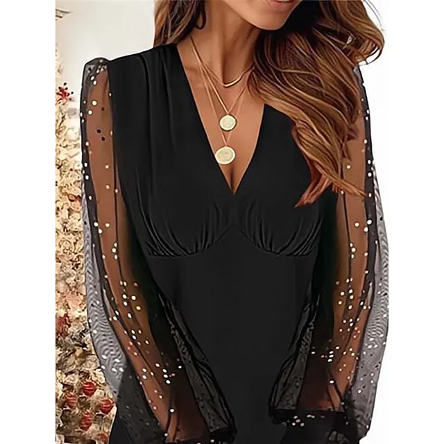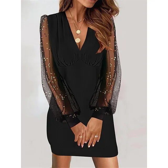 Women’s Black Dress Party Dress Cocktail Mini Wine Long Sleeve Plain Mesh Spring V Neck Fashion Wedding Guest S M L XL XXL 3XL