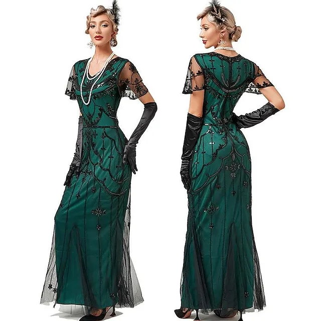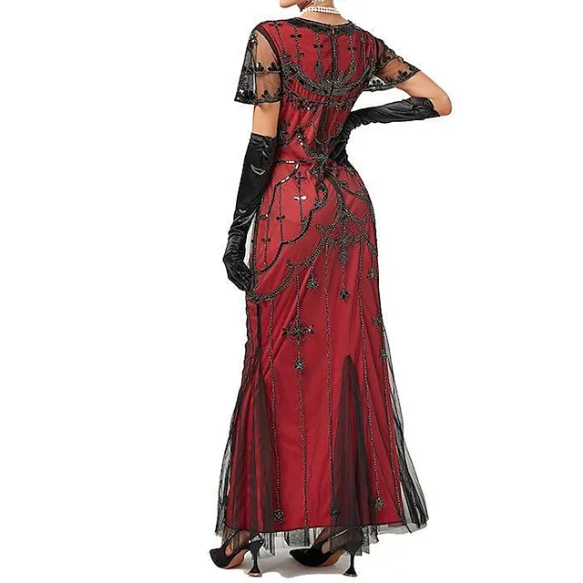 Women’s Black Sequin Dress Prom Dress Party Dress Sparkly Dress Retro 1920s Long Dress Maxi Dress Halloween Mesh Floral V Neck Short Sleeve Regular Fit Spring Fall Black Red XS