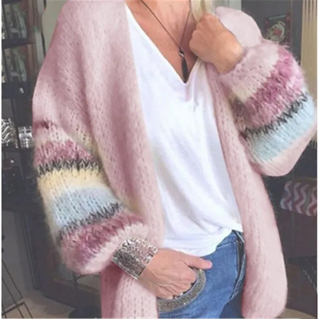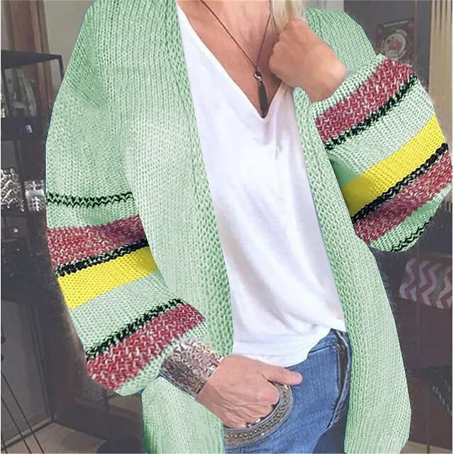 Women’s Cardigan Sweater Open Front Ribbed Knit Acrylic Patchwork Fall Winter Long Daily Going out Weekend Stylish Casual Soft Long Sleeve Geometric Color Block Striped Yellow Light Green Pink S M L