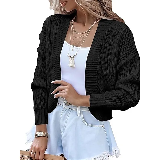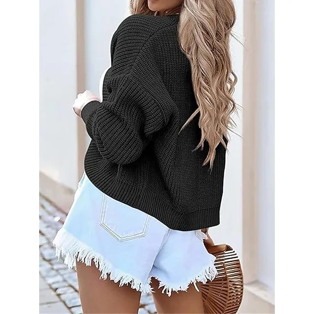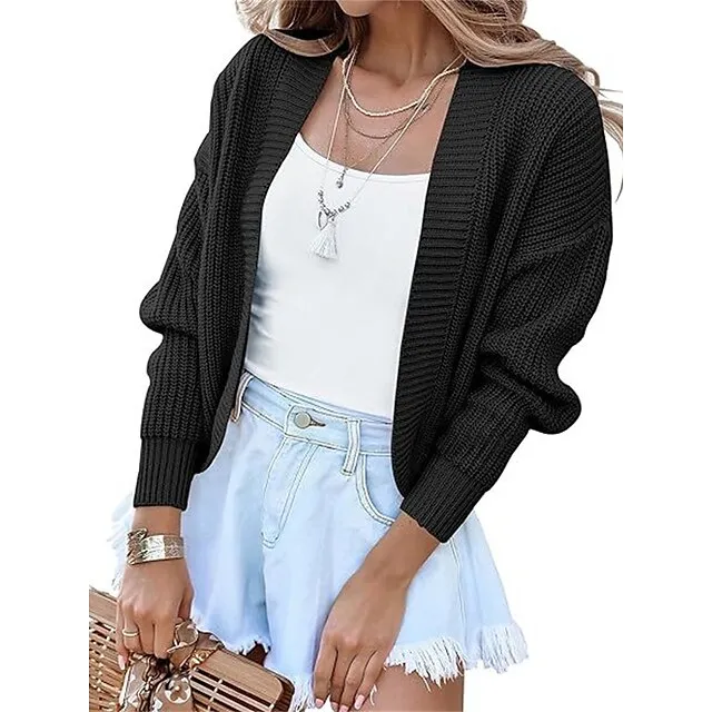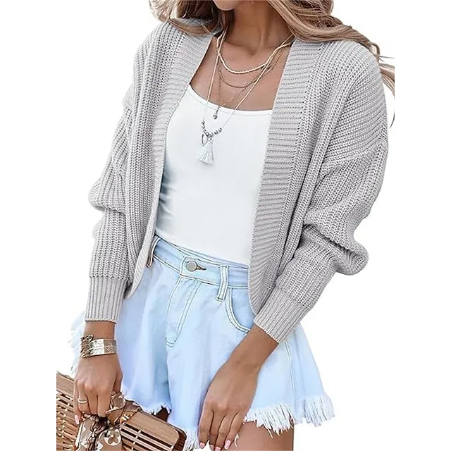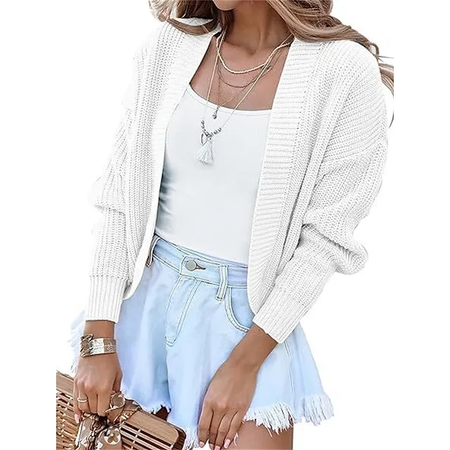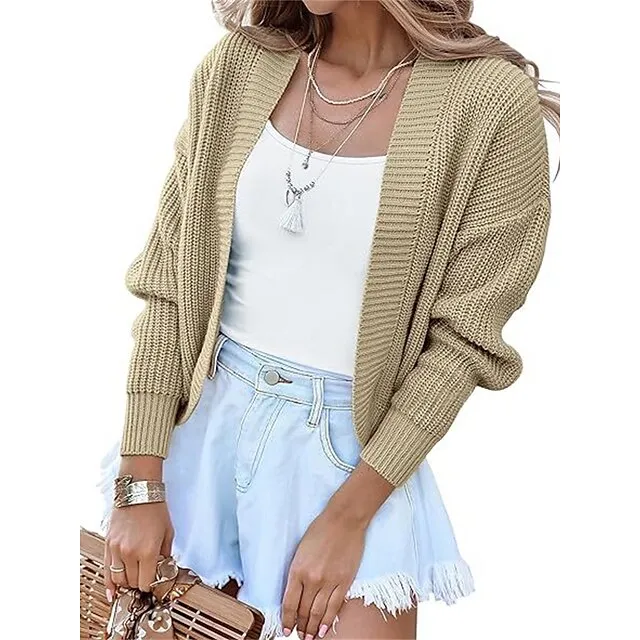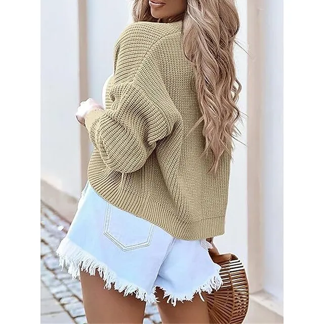 Women’s Cardigan V Neck Ribbed Knit Acrylic Knitted Fall Winter Short Outdoor Daily Going out Fashion Streetwear Casual Long Sleeve Solid Color Black White Khaki S M L