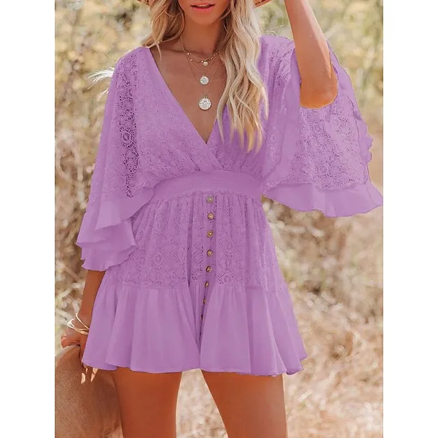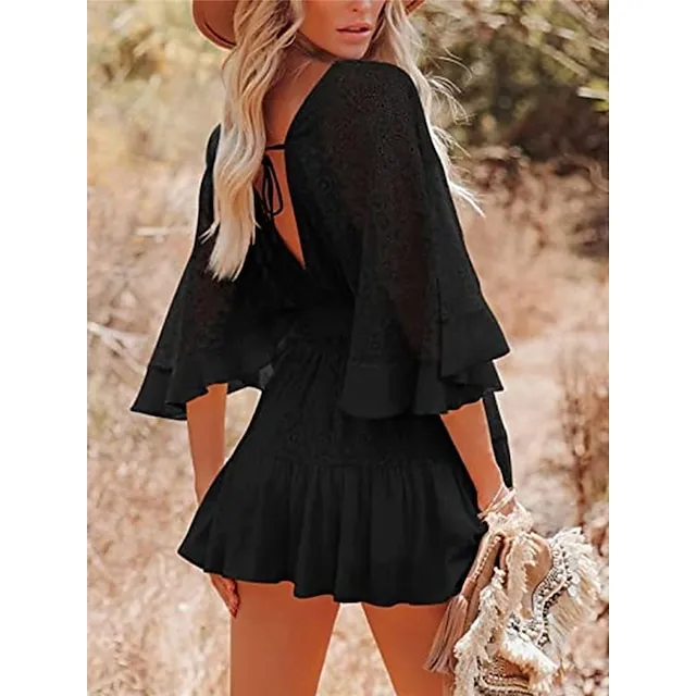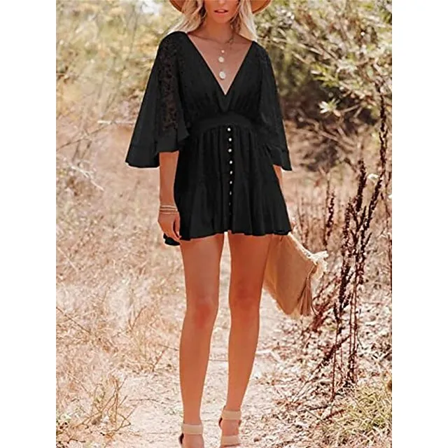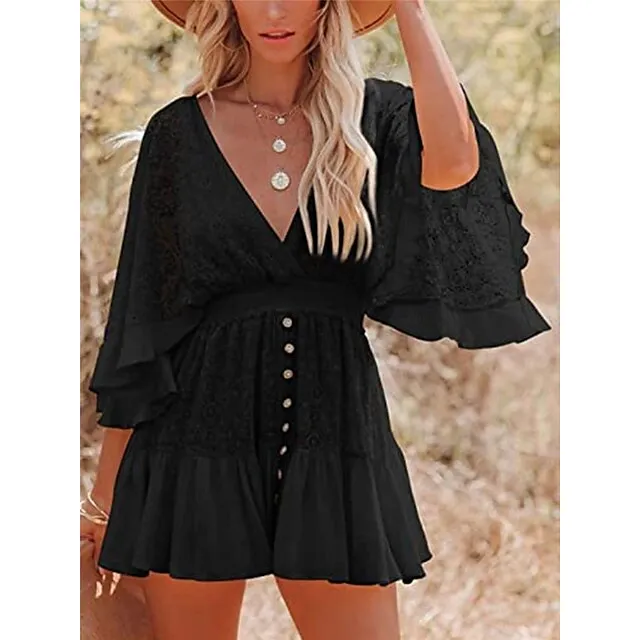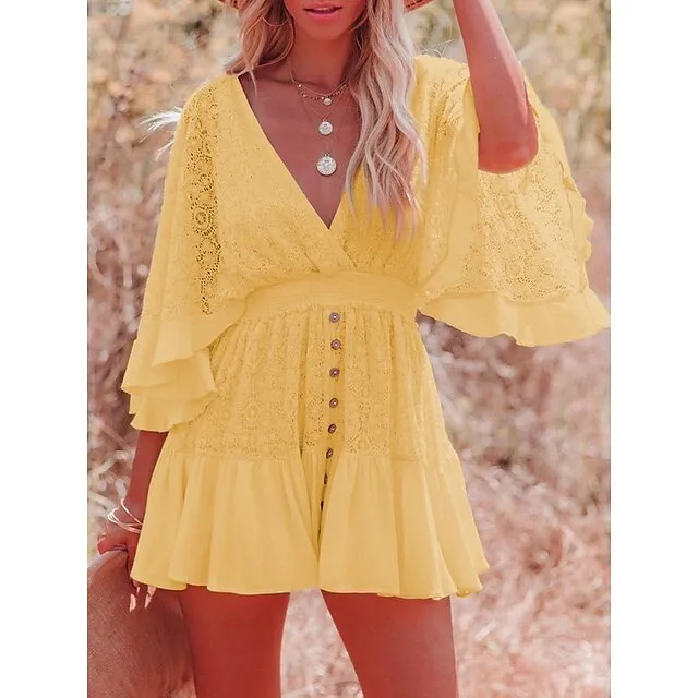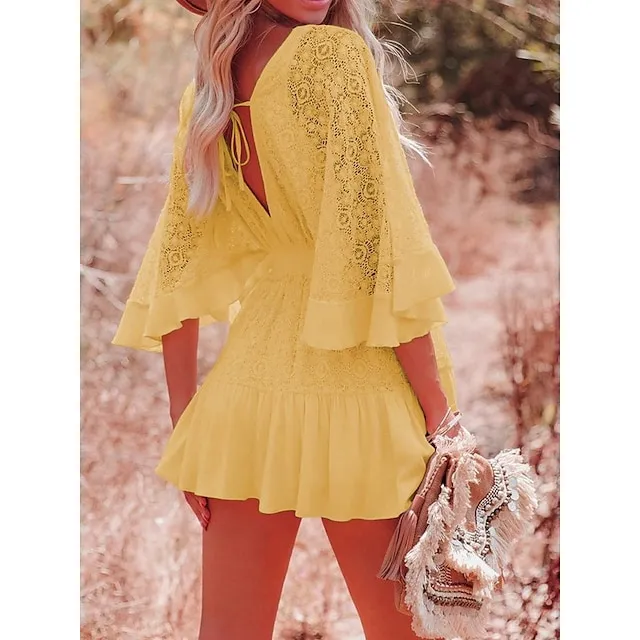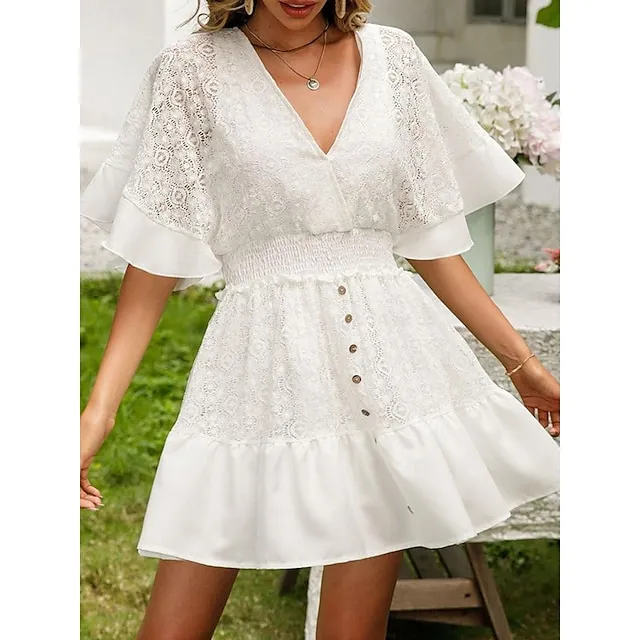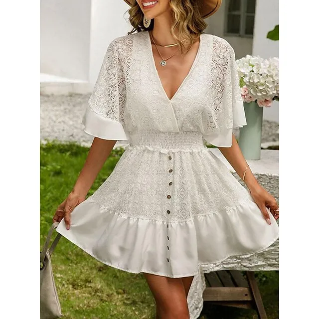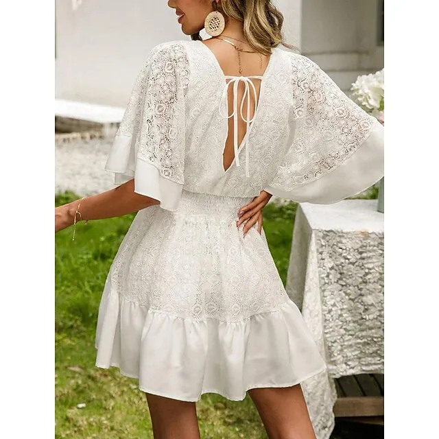 Women’s Casual Dress Lace Dress White Dress Mini Dress Lace Patchwork Street Holiday Date Streetwear A Line V Neck Half Sleeve Regular Fit Black White Yellow Color S M L XL Size
