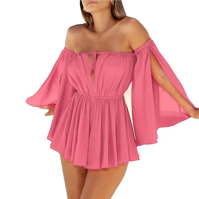 Women‘s Chiffon Dress Mini Dress Black White Yellow Long Sleeve Pure Color Ruched Summer Spring Fall Off Shoulder Casual Summer Dress S M L XL