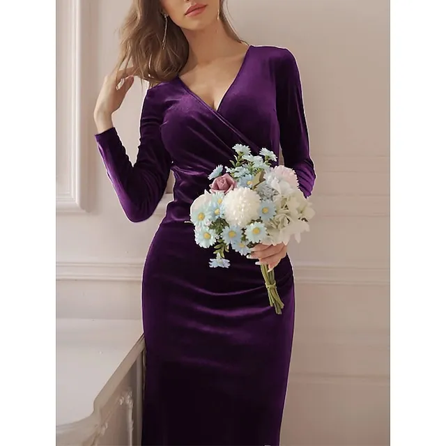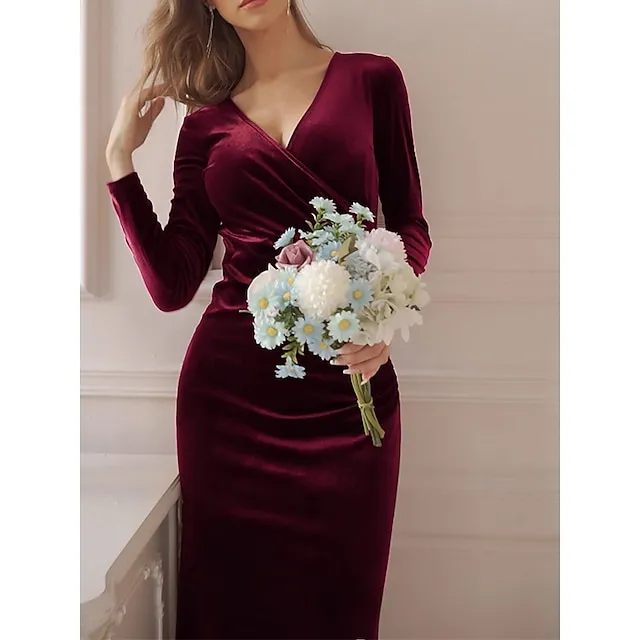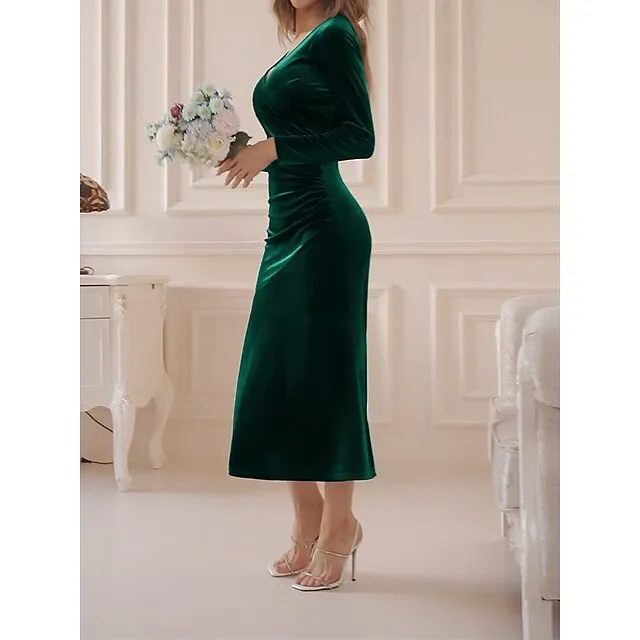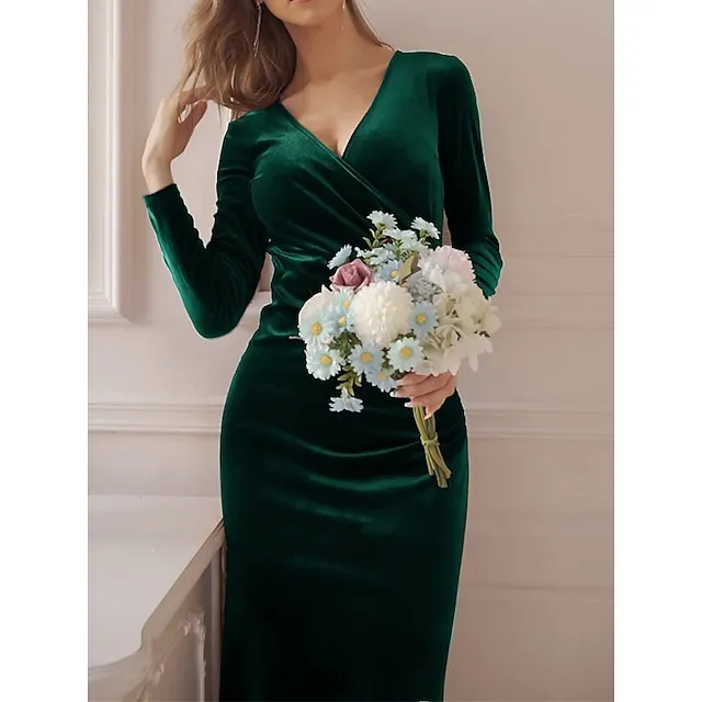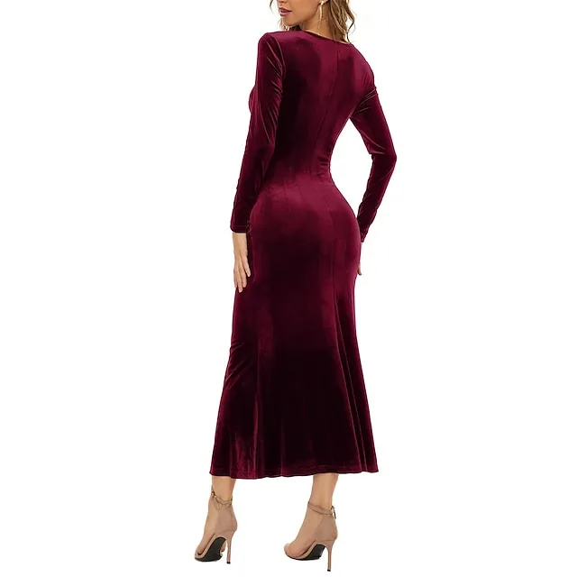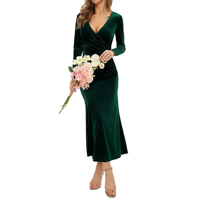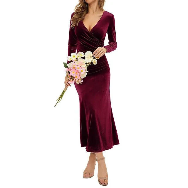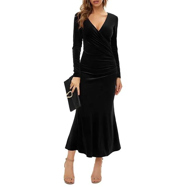 Women’s Christmas Prom Dress Party Dress Velvet Dress Long Dress Maxi Dress Black Wine Dark Green Long Sleeve Pure Color Ruched Spring Fall Winter V Neck