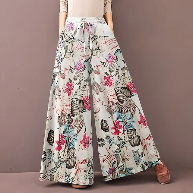 Women’s Wide Leg Pants Print Casual High Full Length Fall Winter White Blue Gray L XL XXL 3XL 4XL / Cotton Blend