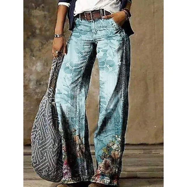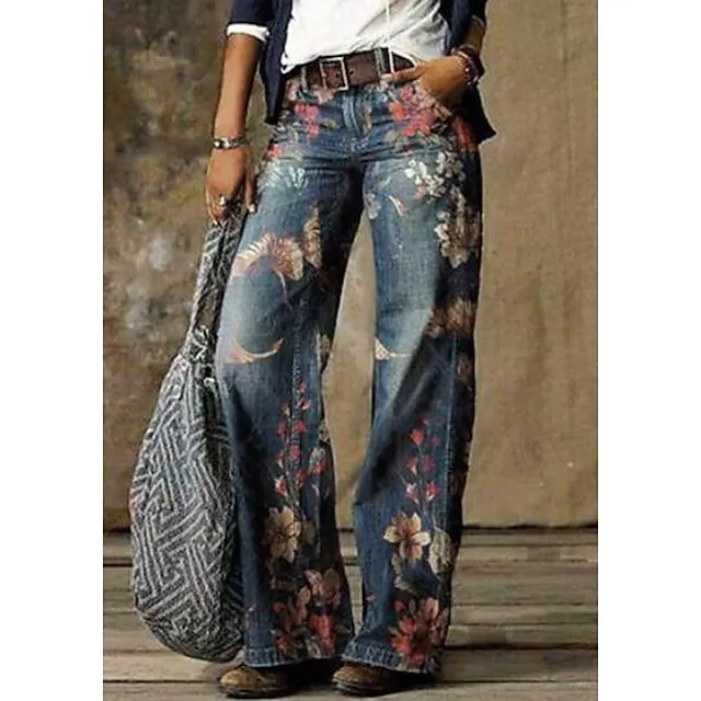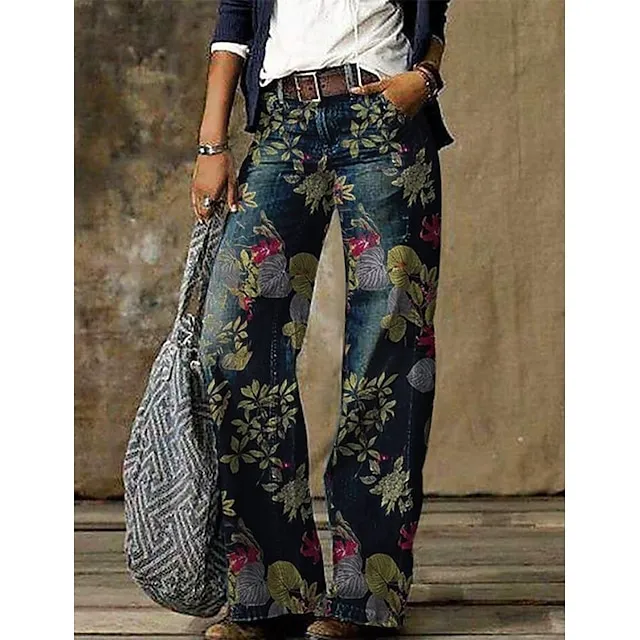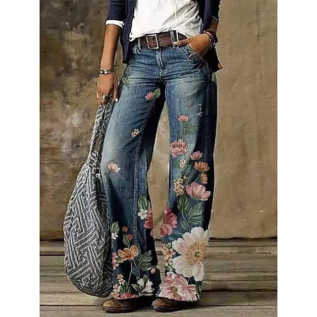 Women’s Jeans Bootcut Wide Leg Faux Denim Geometric Pattern Flower / Floral Wide Leg Print Full Length Micro-elastic Mid Waist Fashion Casual Weekend flower number 6 flower number 18 S M