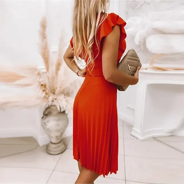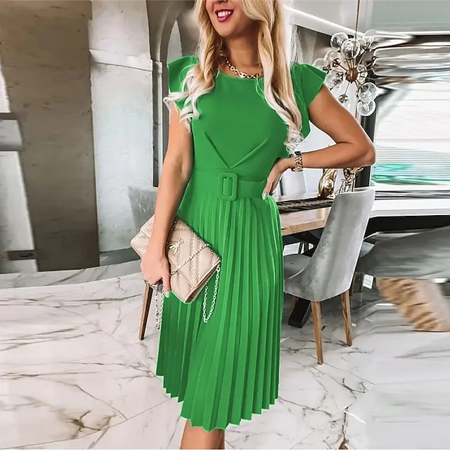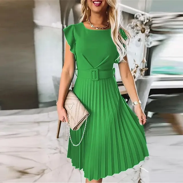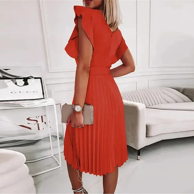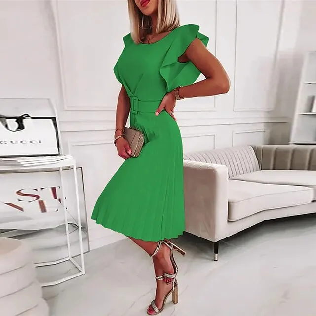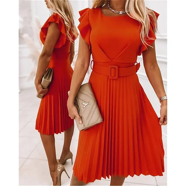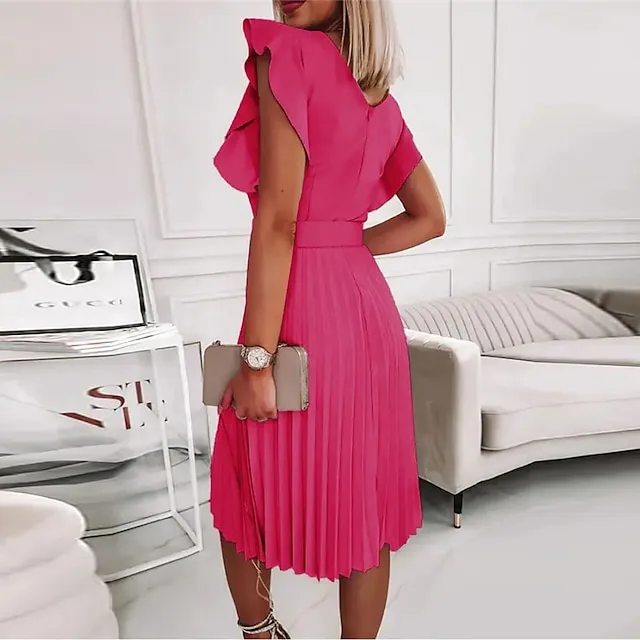 Women’s Party Dress Casual Dress Midi Dress Fuchsia Orange Green Short Sleeve Pure Color Ruffle Summer Spring Crew Neck Work S M L XL XXL 3XL