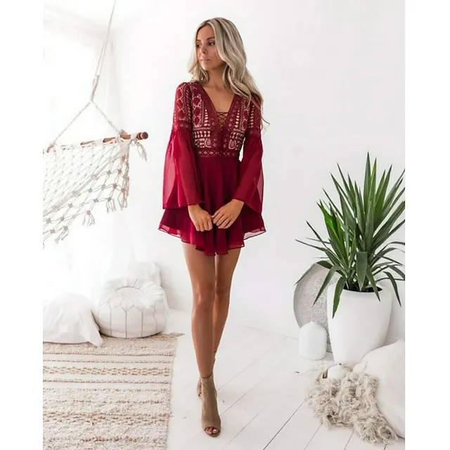 Women’s Party Dress Lace Dress White Dress Mini Dress Black White Wine Long Sleeve Pure Color Lace Summer Spring V Neck Hot Winter Dress Fall Dress Slim S M L XL XXL