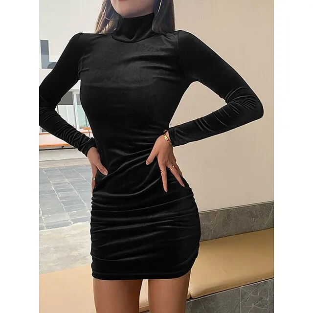 Women’s Party Dress Velvet Dress Wedding Guest Dress Mini Dress Black Pink Wine Long Sleeve Pure Color Ruched Spring Fall Winter High Neck Fashion Winter Dress Evening Party Wedding Guest S M L