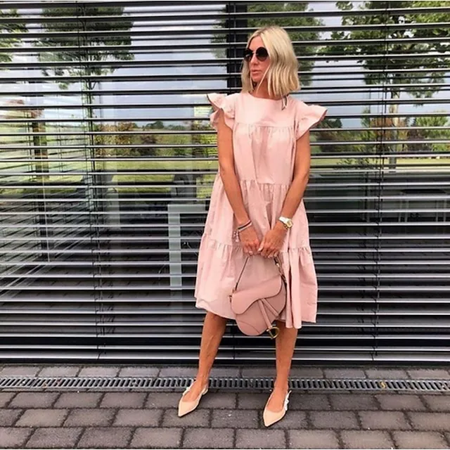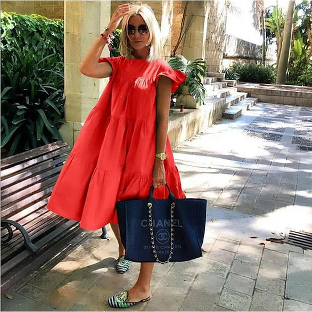 – Look and feel comfortable in this summer loose skirt with short sleeves, round neck, and solid color.