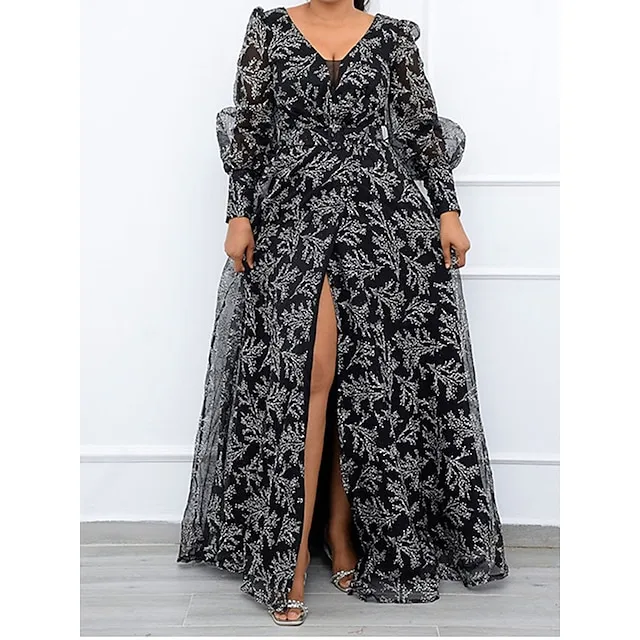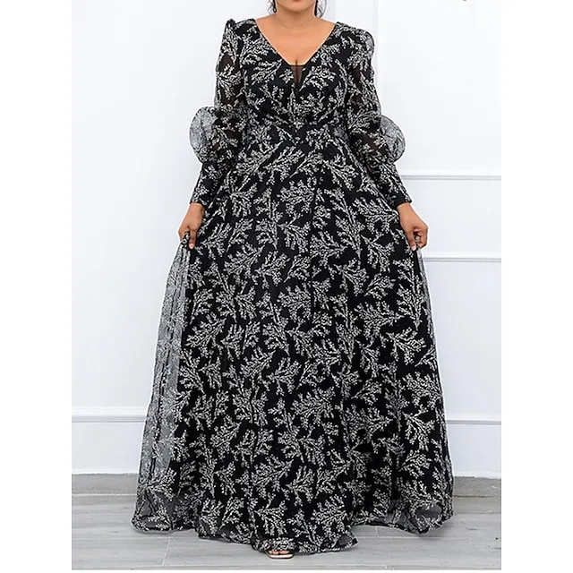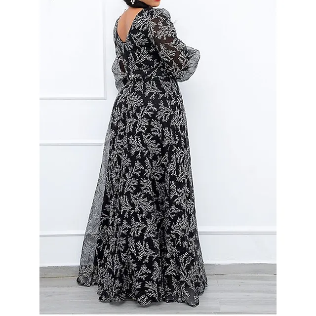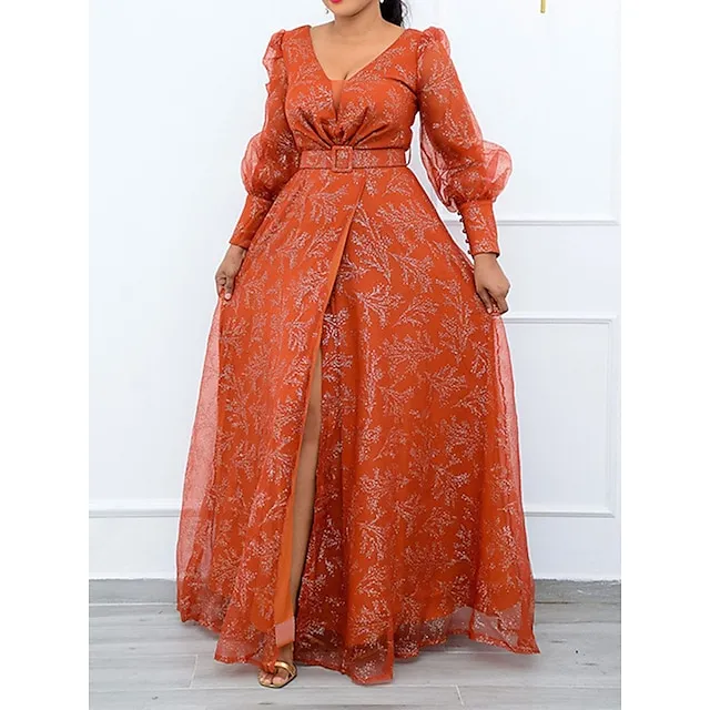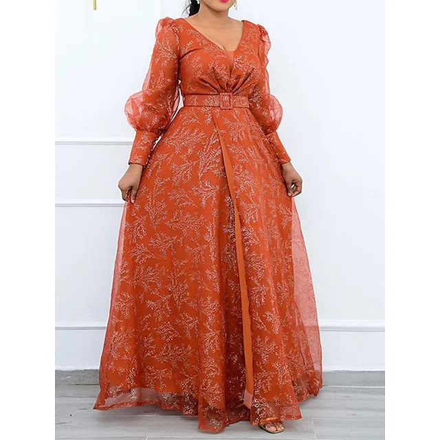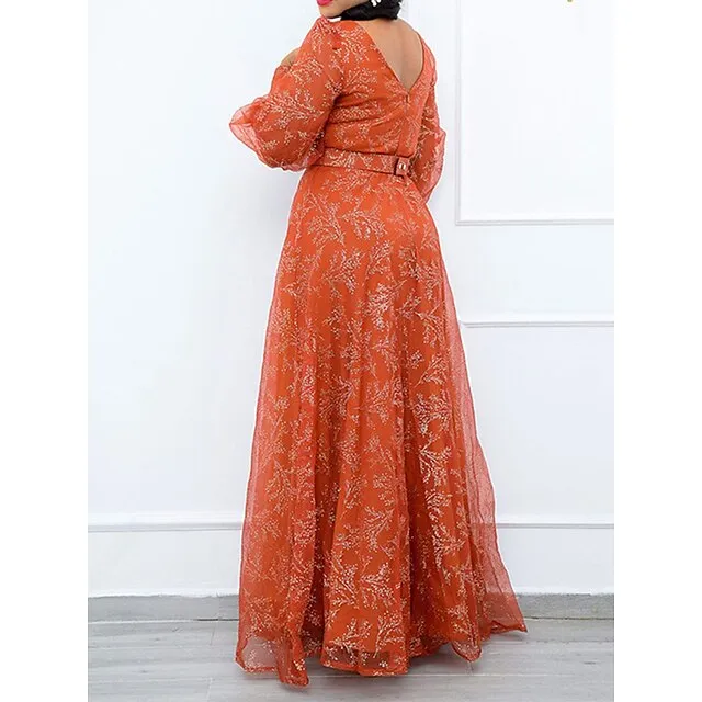 Women’s Plus Size Party Dress Chiffon Dress Wedding Guest Dress Sheath Dress Long Dress Maxi Dress Black Orange Long Sleeve Floral Print Spring Fall Winter V Neck Winter Dress