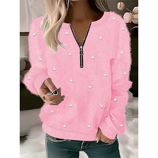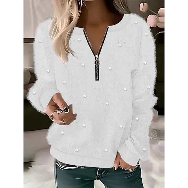 Women’s Pullover Sweater Jumper Crew Neck Fuzzy Knit Cotton Blend Zipper Glitter Fall Winter Regular Date Valentine Casual Soft Long Sleeve Pure Color White Pink S M L