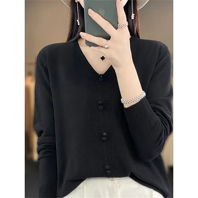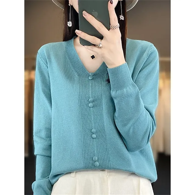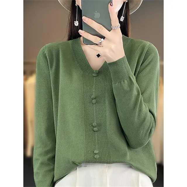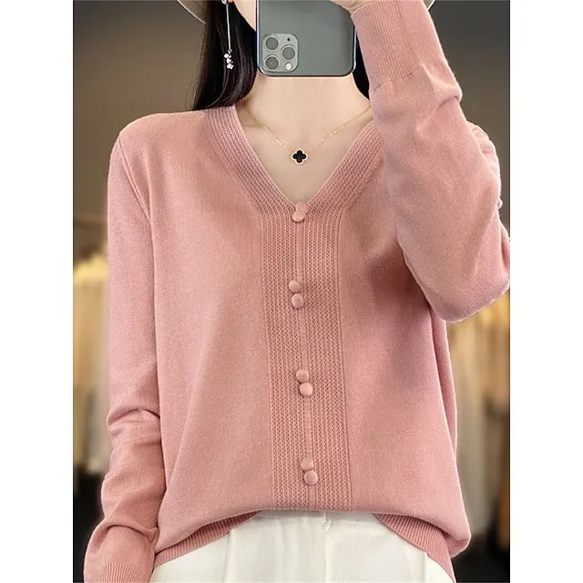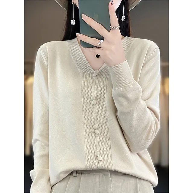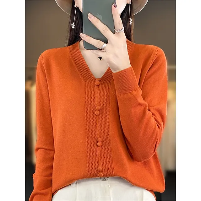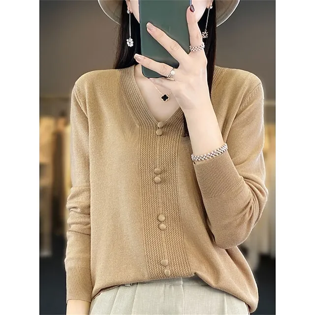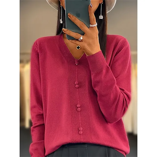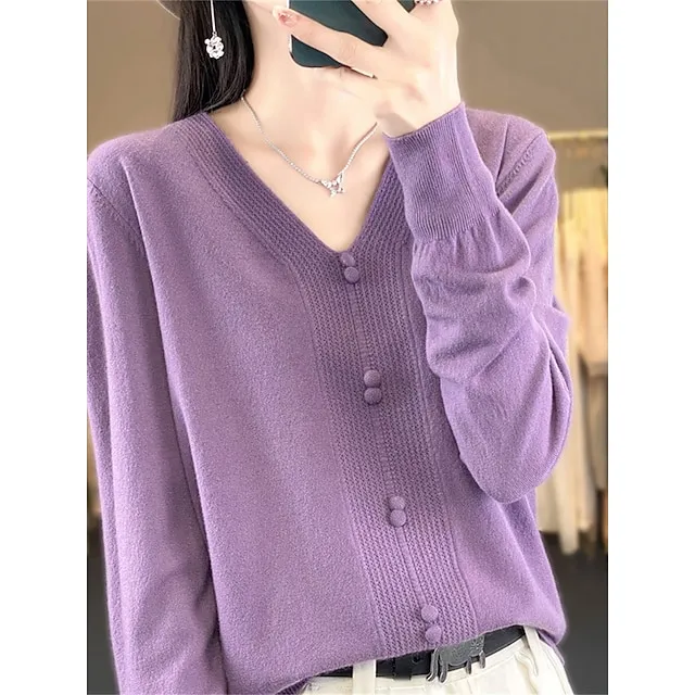 Women’s Pullover Sweater Jumper V Neck Ribbed Knit Cotton Button Fall Winter Short Daily Going out Weekend Stylish Casual Soft Long Sleeve Solid Color Golden camel GH purple GH camel S M L