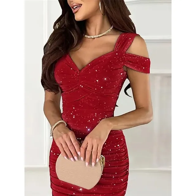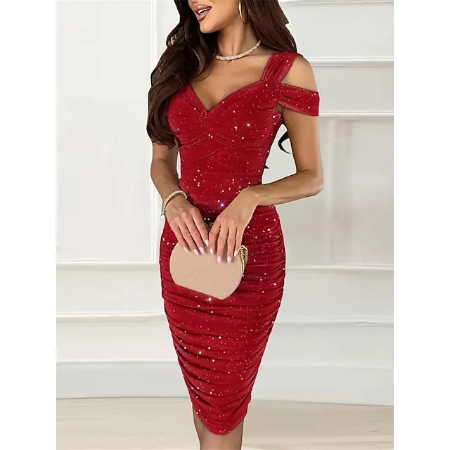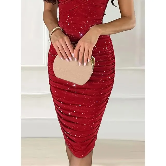 Women’s Red Christmas Party Dress New Year’s Eve Dress Cocktail Dress Wedding Guest Dress Midi Dress Red Short Sleeve Ruched Spring Fall Winter Spaghetti Strap