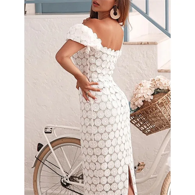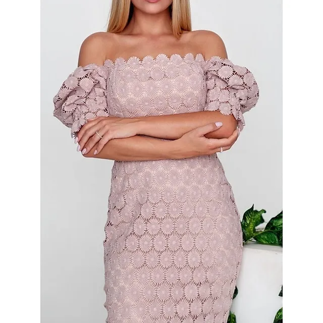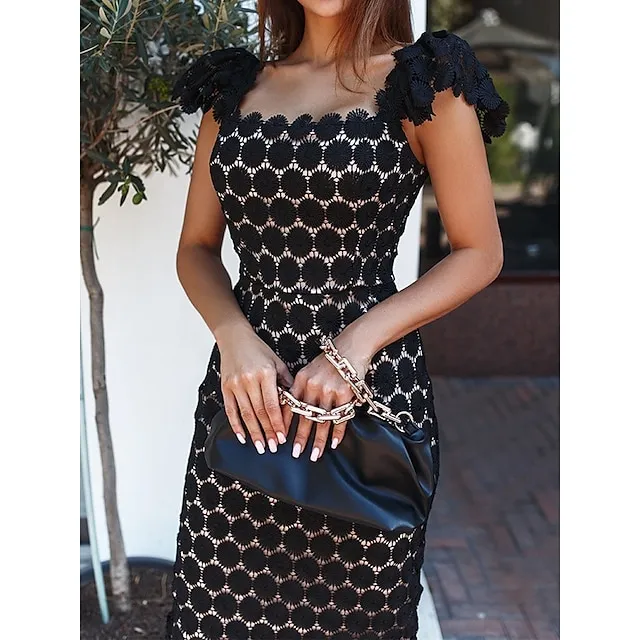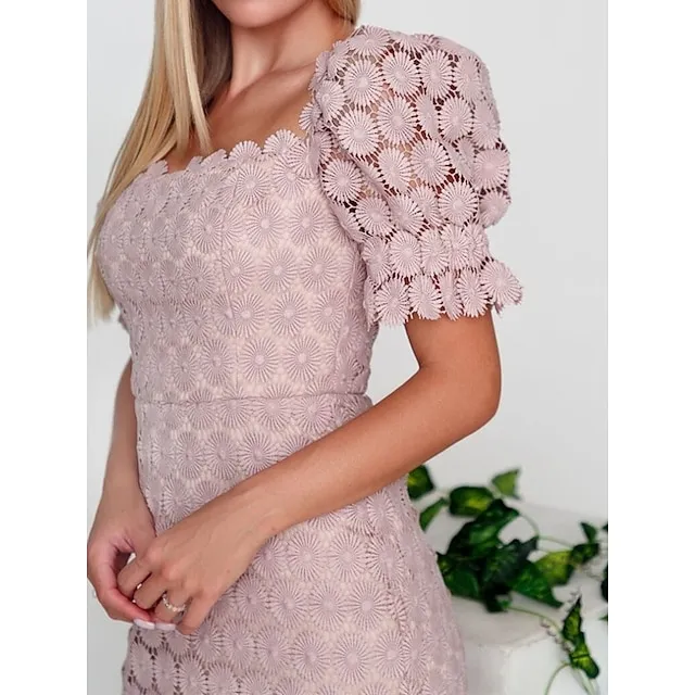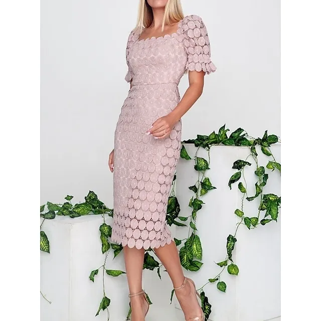 Women’s Sequin Dress Party Dress Lace Dress Midi Dress Black White Pink Short Sleeve Plain Lace Summer Spring Fall Square Neck Elegant Office Wedding Guest S M L XL