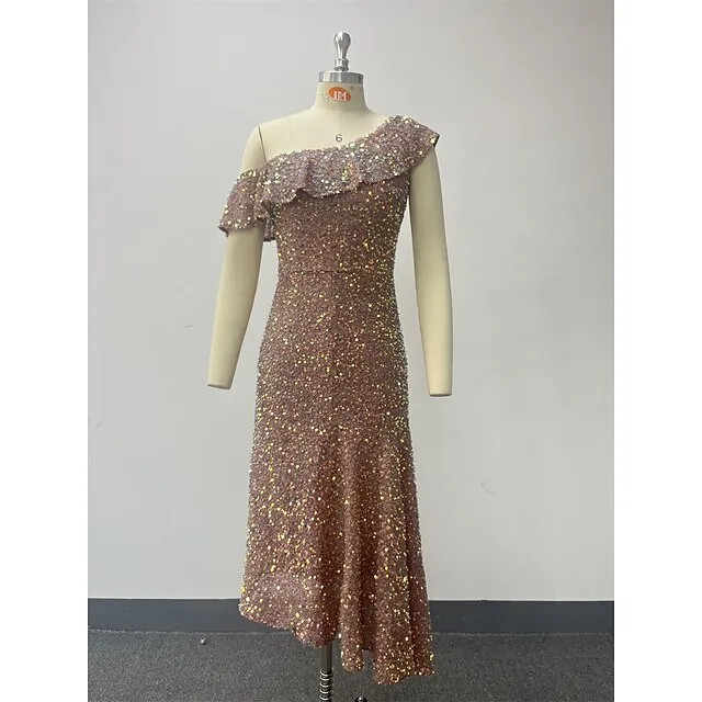 Women’s Sequin Dress Prom Dress Party Dress Midi Dress Khaki Sleeveless Plain Ruched Summer Spring Fall Cold Shoulder Elegant Evening Party S M L XL