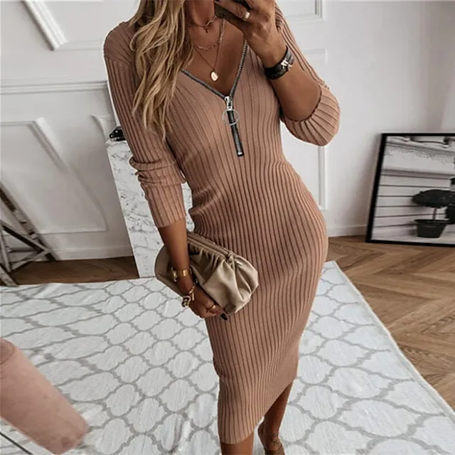 Women’s Sweater Dress Jumper Dress Casual Dress Midi Dress Knitwear Fashion Elegant Dress Pure Color Winter Dress Daily Holiday Fall Dress Deep V Long Sleeve Zipper Regular Fit Black White khaki