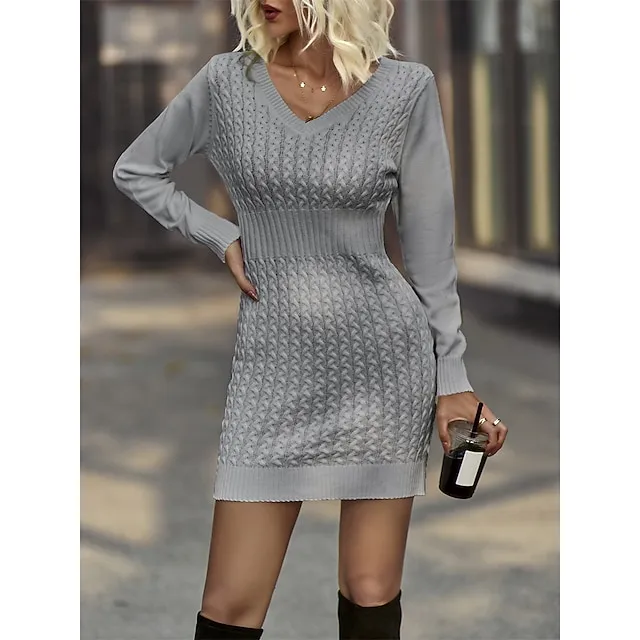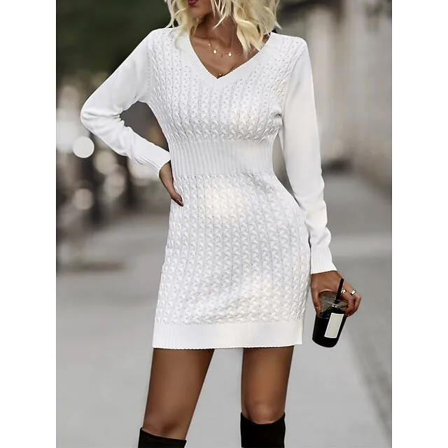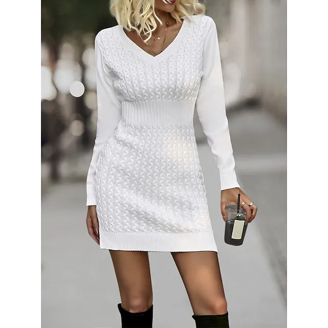 Women’s Sweater Dress Jumper Dress Winter Dress Mini Dress Warm Fashion Casual Plain Outdoor Daily Vacation Going out V Neck Long Sleeve Loose Fit White Gray S M L XL XXL