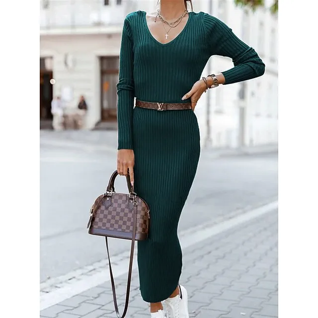 Women’s Sweater Dress Knit Dress Jumper Dress Midi Dress Knitwear Fashion Daily Plain Outdoor Daily Going out V Neck Long Sleeve Belted Regular Fit White Green XS S M L XL XXL 3XL