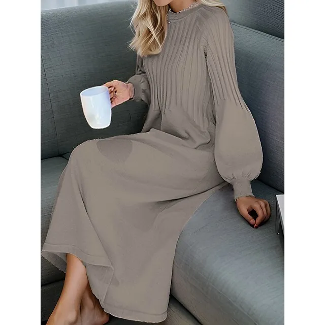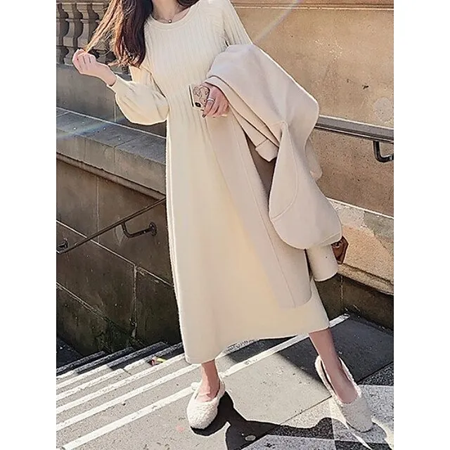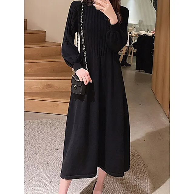 Women’s Sweater Dress Knit Dress Jumper Dress Midi Dress Knitwear Fashion Daily Pure Color Outdoor Daily Vacation Going out Crew Neck Long Sleeve Ruched Patchwork Regular Fit Black khaki Apricot