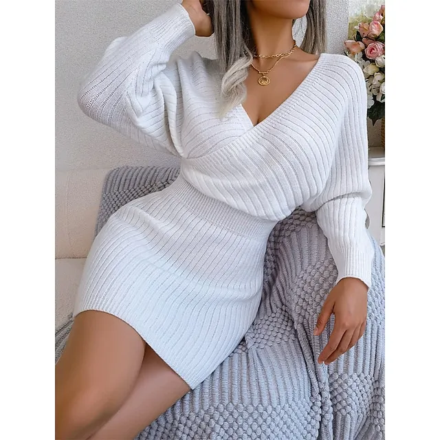 Women’s Sweater Dress Knit Dress Jumper Dress Mini Dress Knitwear Warm Fashion Pure Color Outdoor Casual Daily Going out Surplice Neck Long Sleeve Ruched Regular Fit Black White Blue S M L