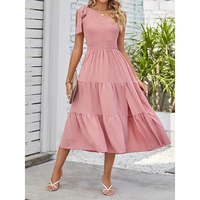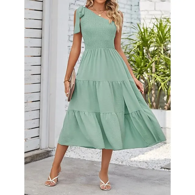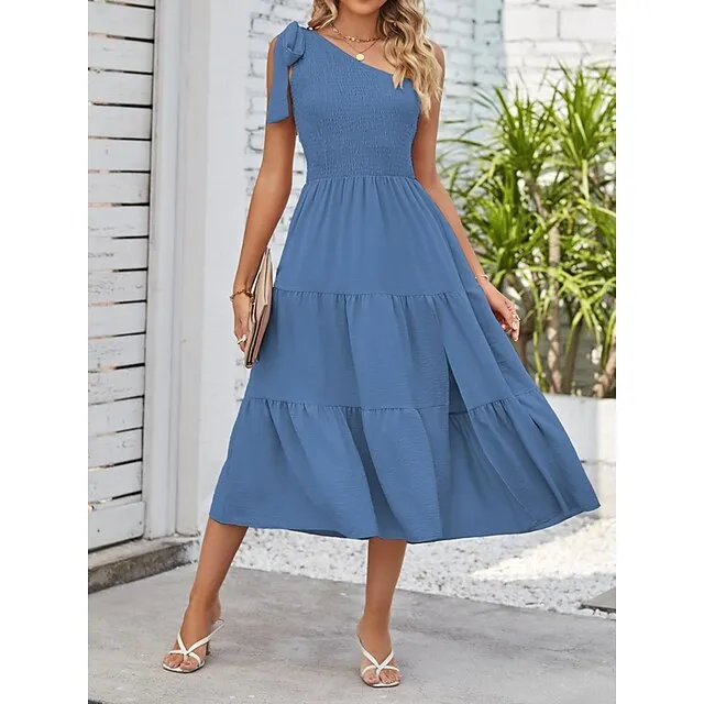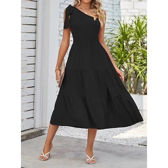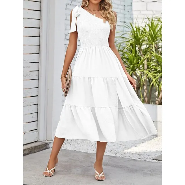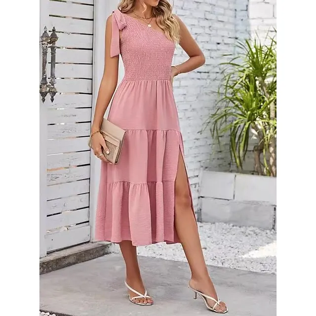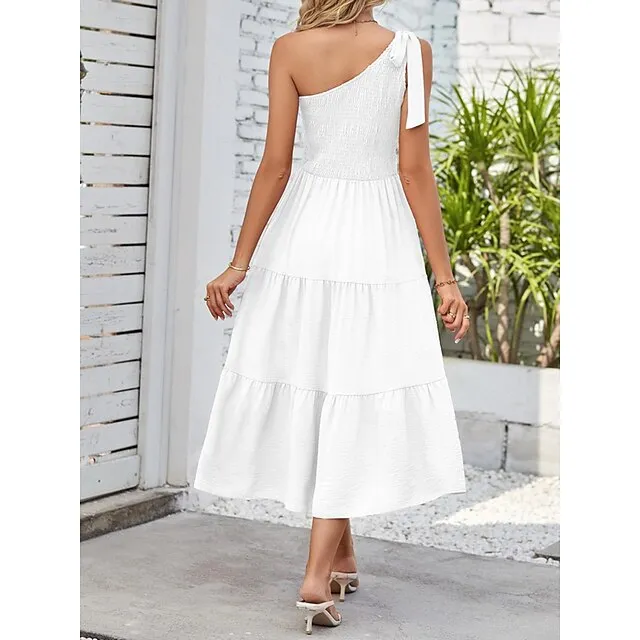 Women’s White Dress Casual Dress Summer Dress Midi Dress Split Cold Shoulder Date Streetwear One Shoulder Sleeveless Regular Fit Black White Pink Color S M L XL Size