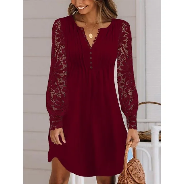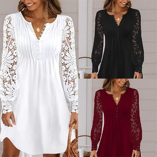 Women’s White Dress Lace Dress Casual Dress Mini Dress Contrast Lace Lace Daily Holiday Date Fashion Modern Crew Neck Long Sleeve Regular Fit Black White Wine Color S M L XL XXL Size