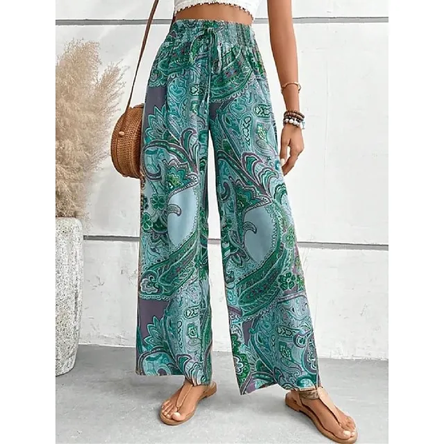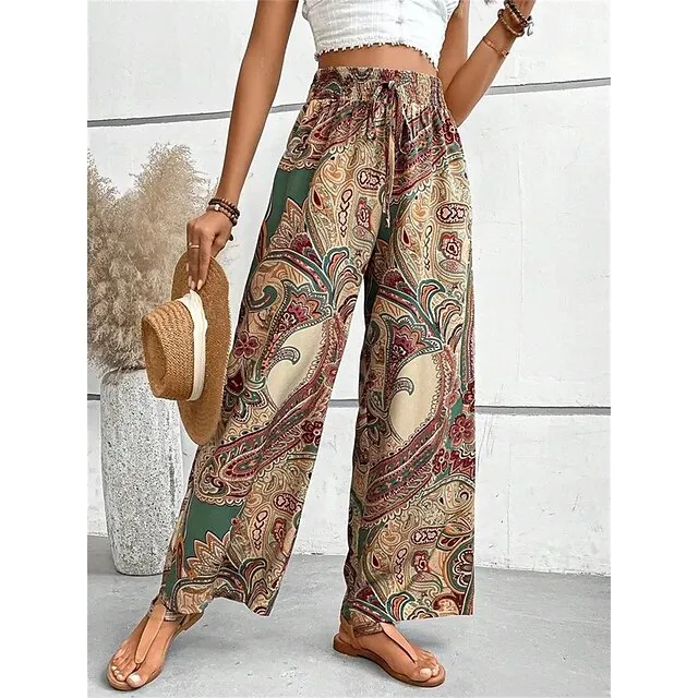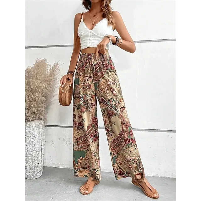Women’s Wide Leg Chinos Pants Trousers Flower Baggy Print Full Length Micro-elastic High Waist Vacation Ethnic Daily Wear Vacation Purple Gold S M Summer Fall