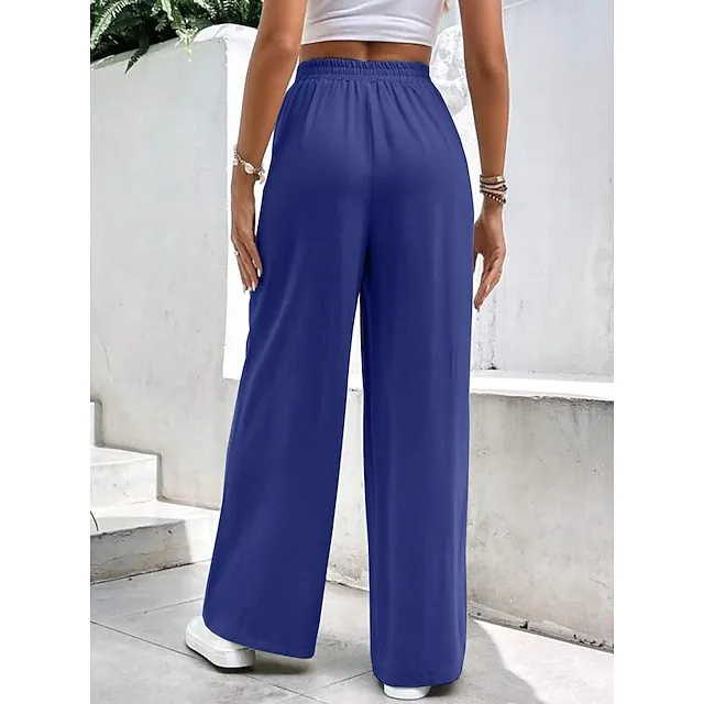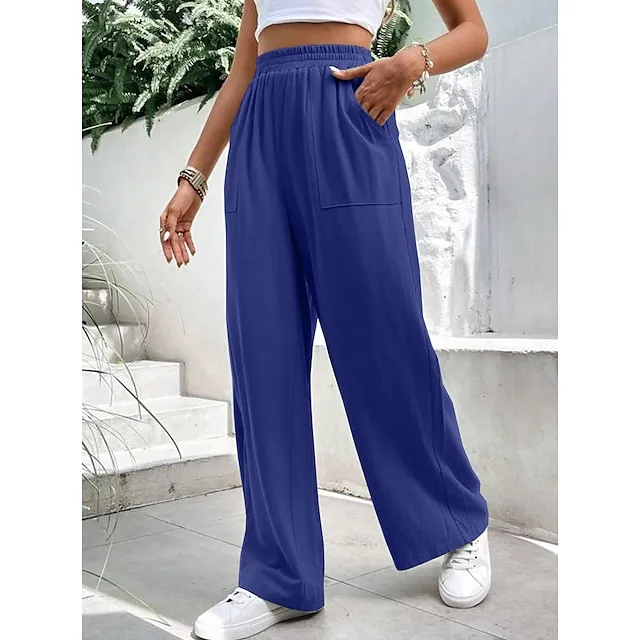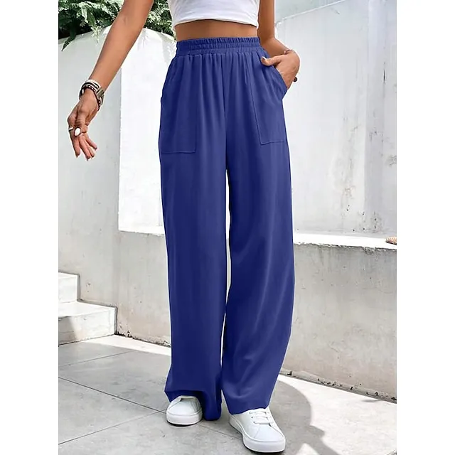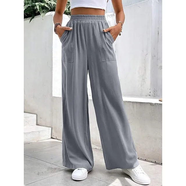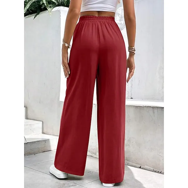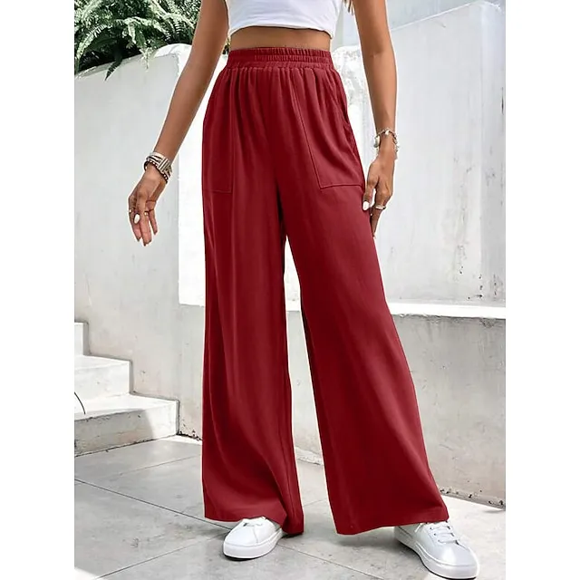 Women’s Wide Leg Pants Trousers Linen Cotton Blend Plain Side Pockets Wide Leg Full Length Casual Daily Going out Weekend Burgundy Blue S M Spring & Summer
