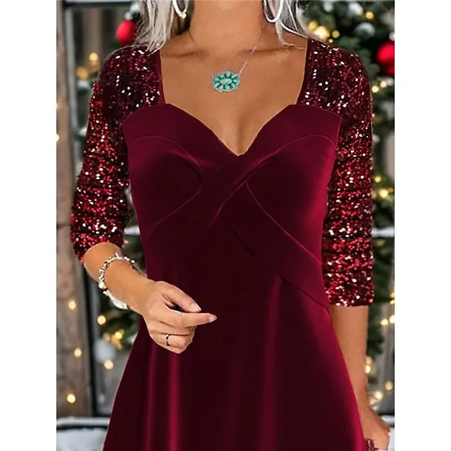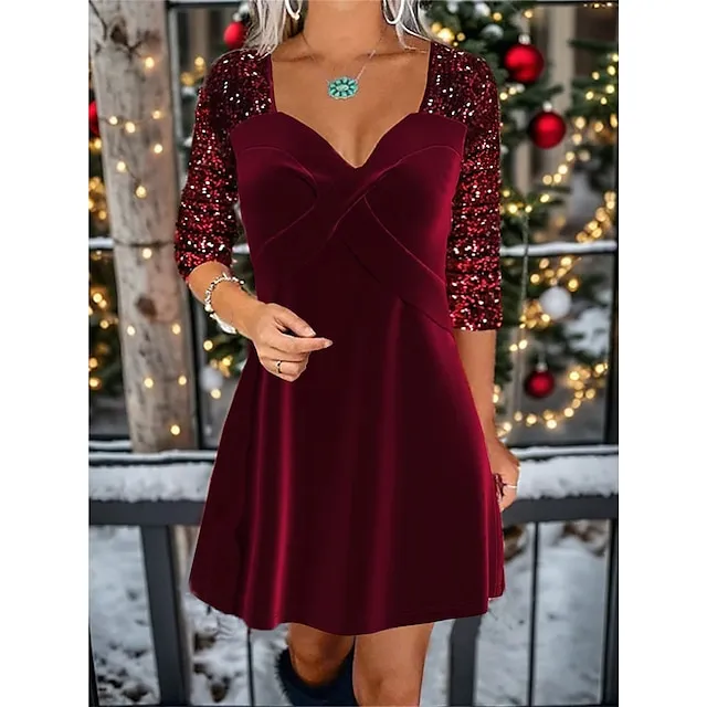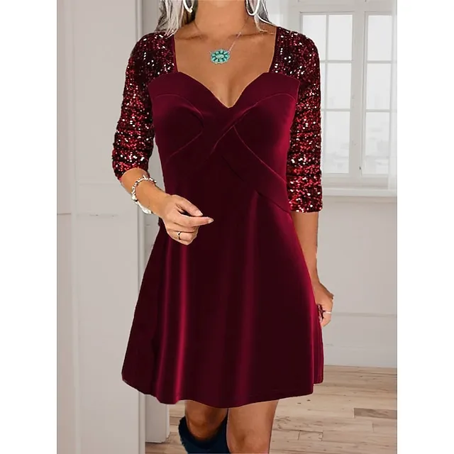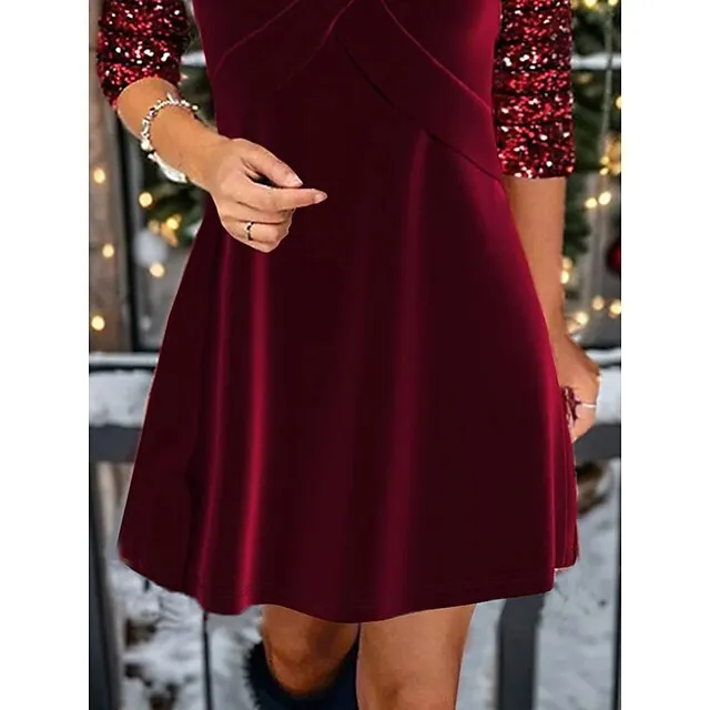 Women’s Wine Red Velvet Dress Sequin Dress Party Dress Mini Dress Long Sleeve Star Sequins Spring Fall Winter V Neck Birthday S M L XL XXL 3XL